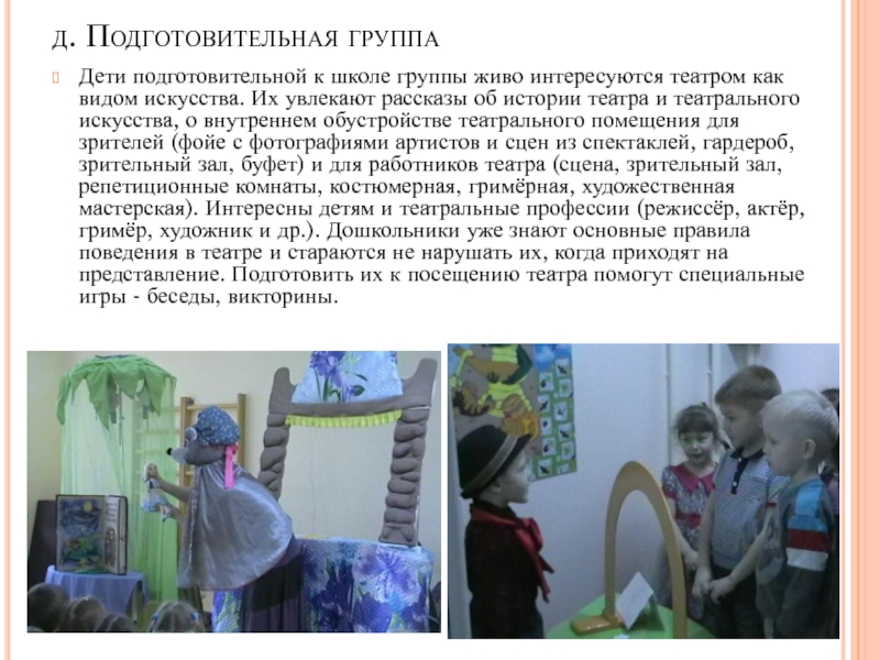 как видом искусства. Их увлекают рассказы об истории театра и театрального искусства, о внутреннем обустройстве театрального помещения для зрителей (фойе с фотографиями артистов и сцен из спектаклей, гардероб, зрительный зал, буфет) и для работников театра (сцена, зрительный зал, репетиционные комнаты, костюмерная, гримёрная, художественная мастерская). Интересны детям и театральные профессии (режиссёр, актёр, гримёр, художник и др.). Дошкольники уже знают основные правила поведения в театре и стараются не нарушать их, когда приходят на представление. Подготовить их к посещению театра помогут специальные игры - беседы, викторины.