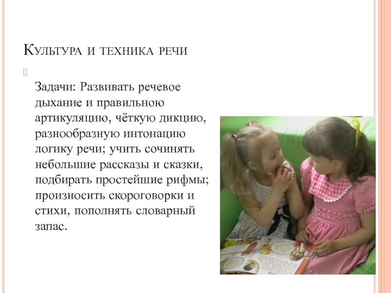 дикцию, разнообразную интонацию логику речи; учить сочинять небольшие рассказы и сказки, подбирать простейшие рифмы; произносить скороговорки и стихи, пополнять словарный запас.
