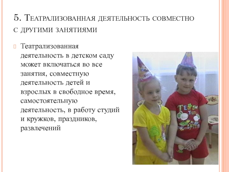1. Совместная театрализованная деятельность взрослых и детей, музей кукол, театральное занятие, театрализованная игра на праздниках и развлечениях.