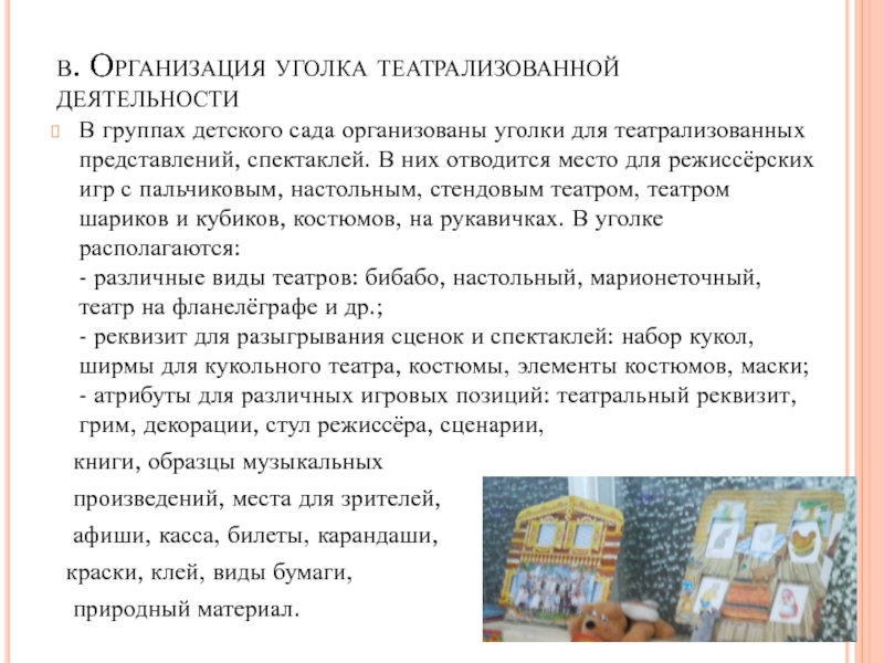 в. Организация уголка театрализованной деятельности