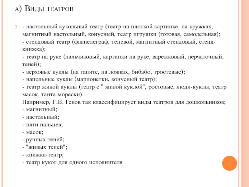 Например, Г.В. Генов так классифицирует виды театров для дошкольников;