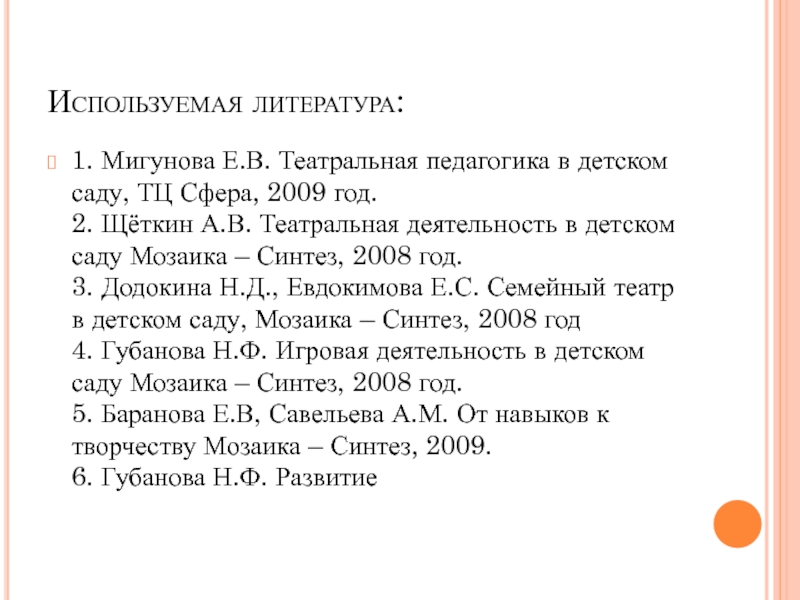 2. Щёткин А.В. Театральная деятельность в детском саду Мозаика – Синтез, 2008 год.