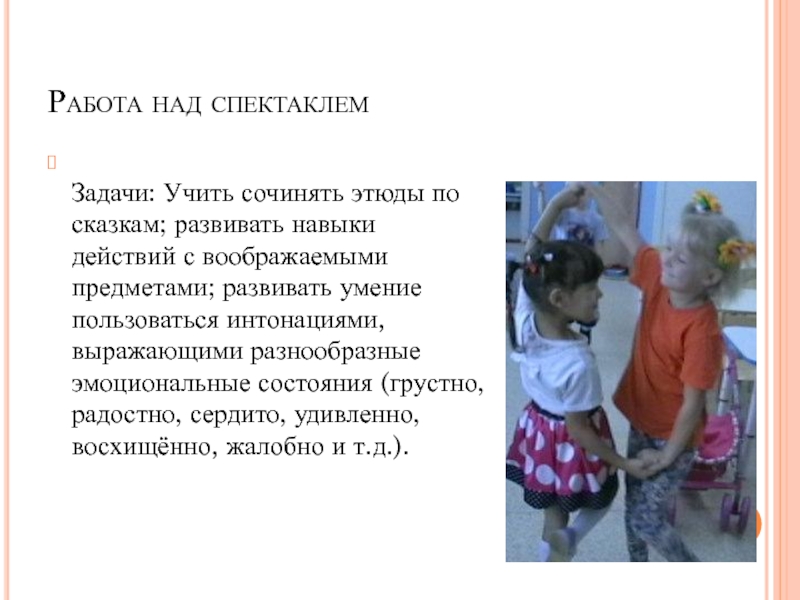 Задачи: Учить сочинять этюды по сказкам; развивать навыки действий