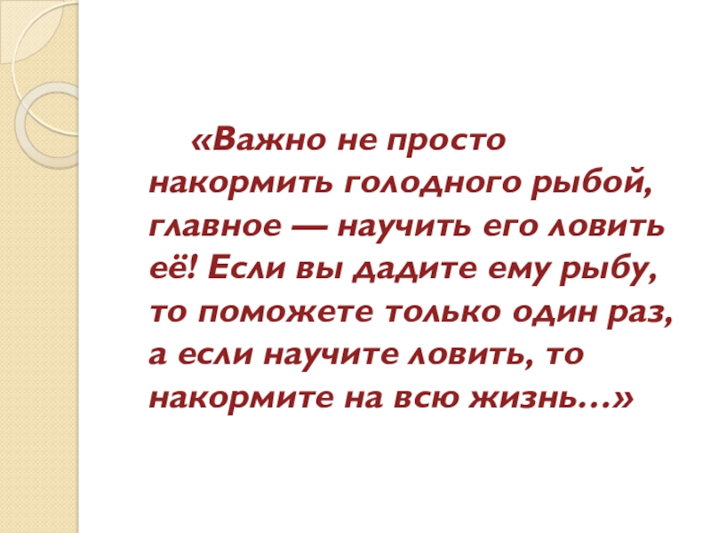 Слайд 11 «Важно не просто накормить голодного рыбой, главное — научить его ловить