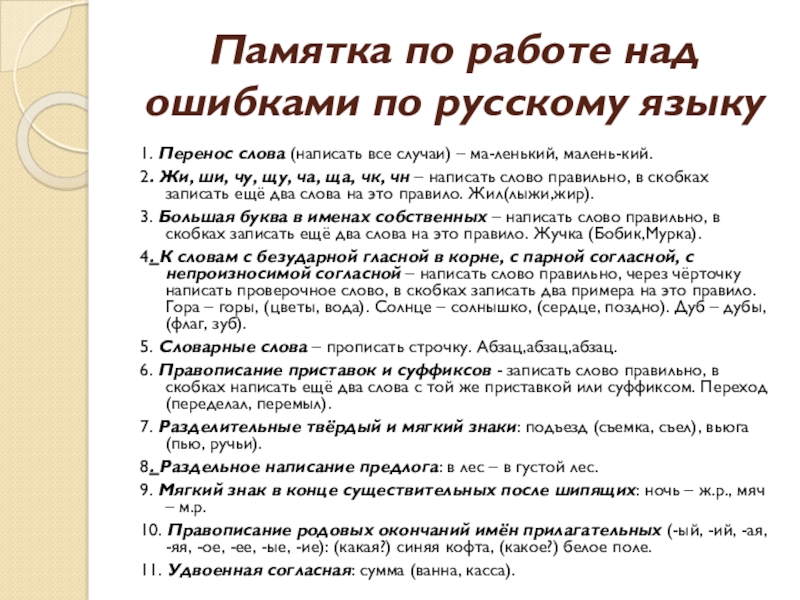 Памятка по работе над ошибками по русскому языку
