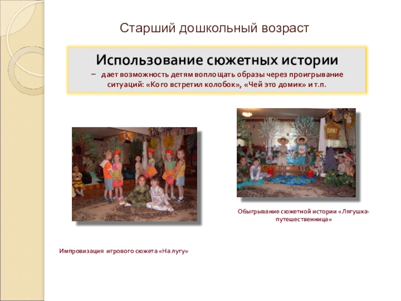Инсценируют хороводы, немудреные песенки, в которых есть развитие сюжета.