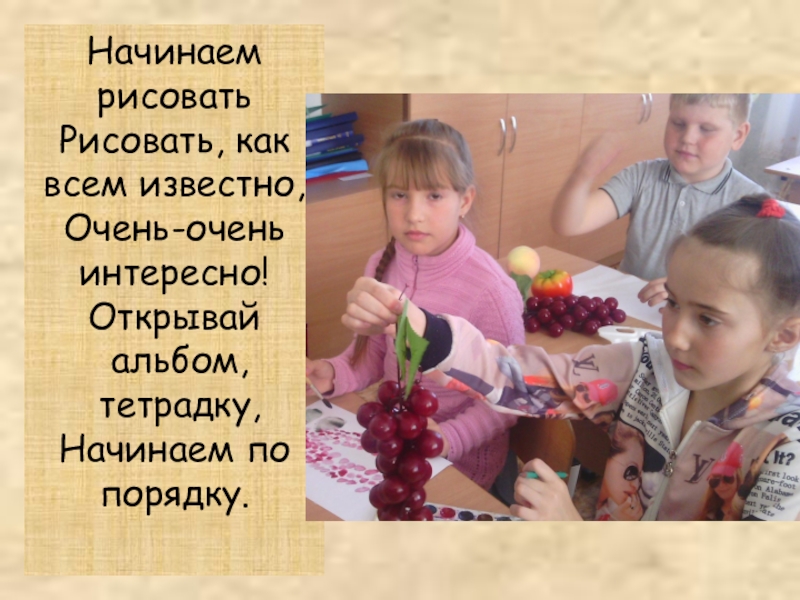 Начинаем рисовать  Рисовать, как всем известно,  Очень-очень интересно!  Открывай альбом, тетрадку,  Начинаем по порядку.