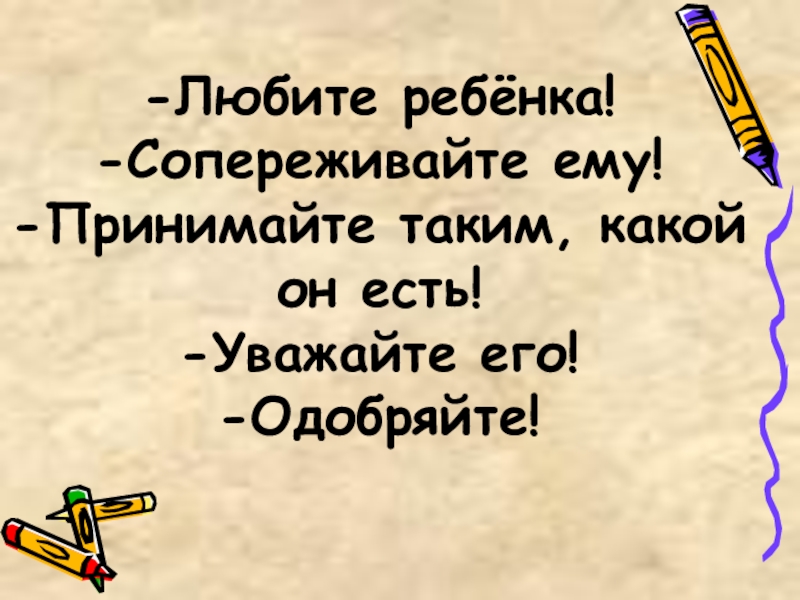 -Любите ребёнка! -Сопереживайте ему! -Принимайте таким, какой он есть! -Уважайте его! -Одобряйте!