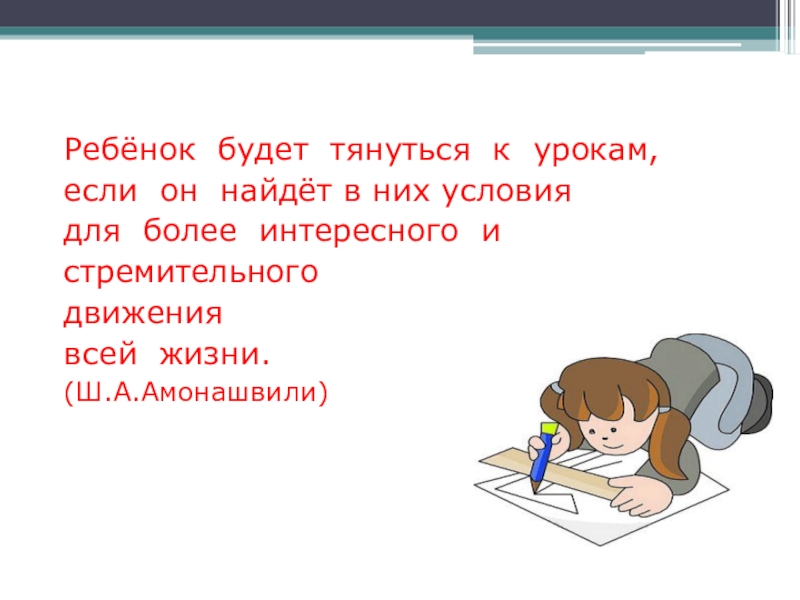 Ребёнок будет тянуться к урокам,если он найдёт в них условиядля более интересного и стремительногодвижениявсей жизни.(Ш.А.Амонашвили)