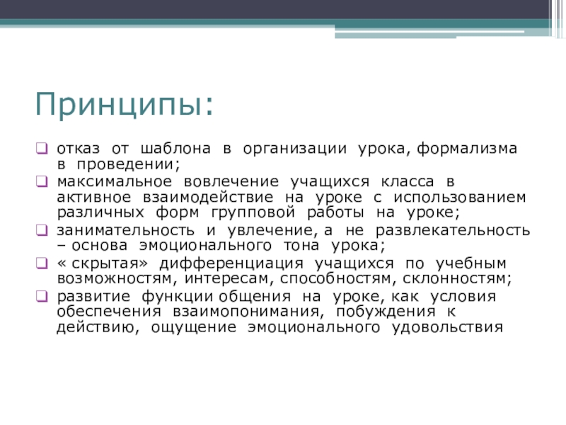 Принципы:отказ от шаблона в организации урока, формализма в проведении;максимальное вовлечение учащихся класса в активное взаимодействие на уроке