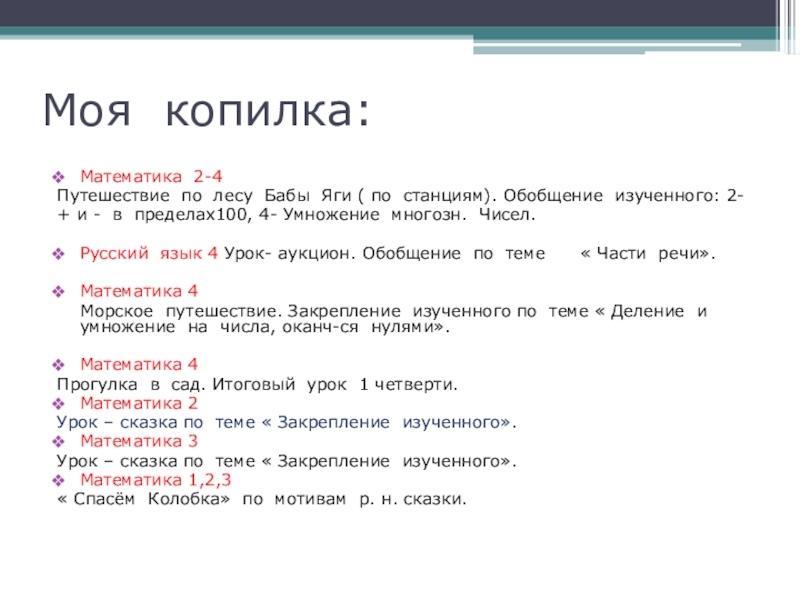 Моя копилка:Математика 2-4Путешествие по лесу Бабы Яги ( по станциям). Обобщение изученного: 2- + и - в