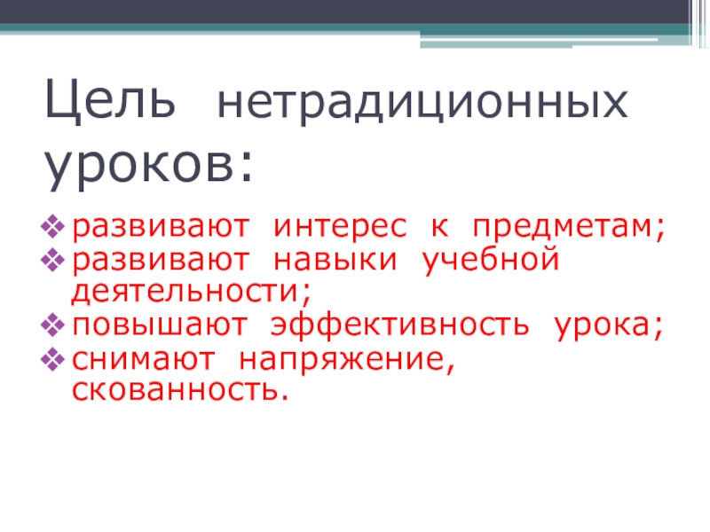 Цель нетрадиционных уроков:развивают интерес к предметам;развивают навыки учебной деятельности;повышают эффективность урока;снимают напряжение, скованность.
