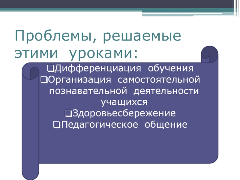 Проблемы, решаемые этими уроками:Дифференциация обученияОрганизация самостоятельной познавательной деятельности учащихсяЗдоровьесбережениеПедагогическое общение