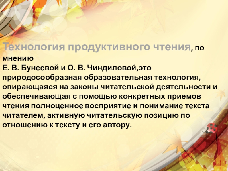 Чиндиловой,это природосообразная образовательная технология, опирающаяся на законы читательской деятельности и обеспечивающая с помощью конкретных приемов чтения полноценное восприятие и понимание текста читателем, активную читательскую позицию по отношению к тексту и его автору.