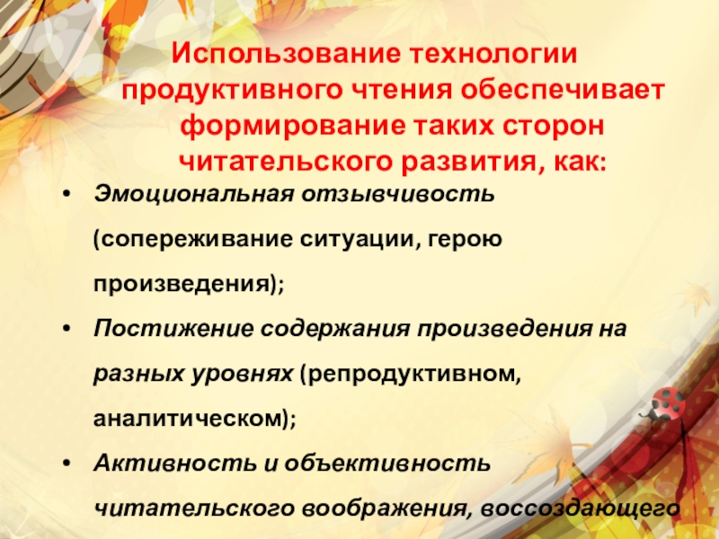 Слайд 21Использование технологии продуктивного чтения обеспечивает формирование таких сторон читательского развития, как: