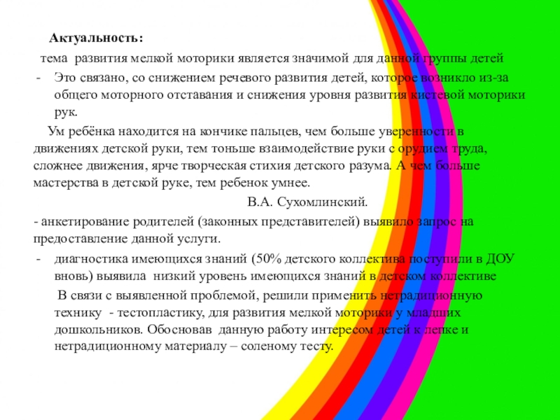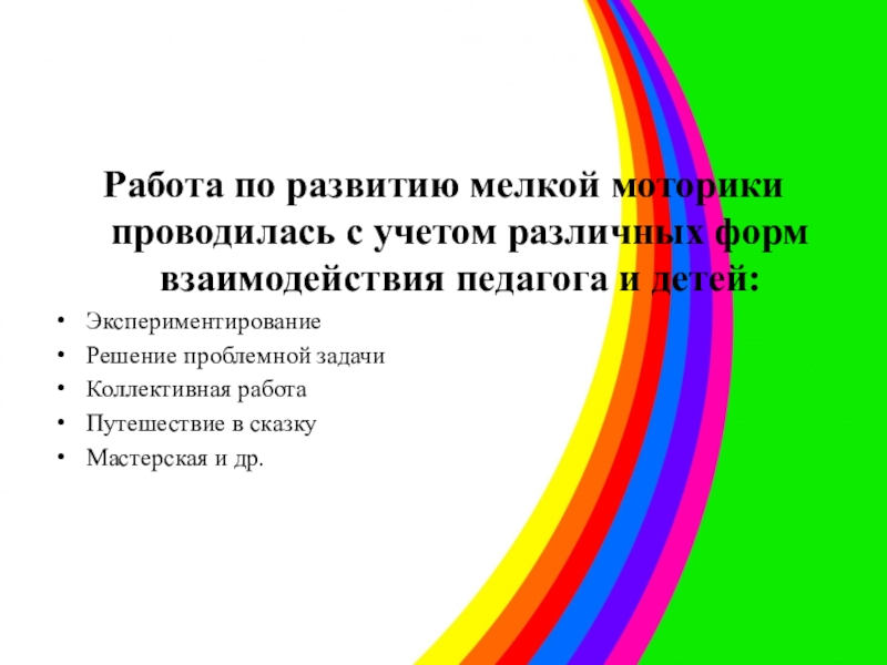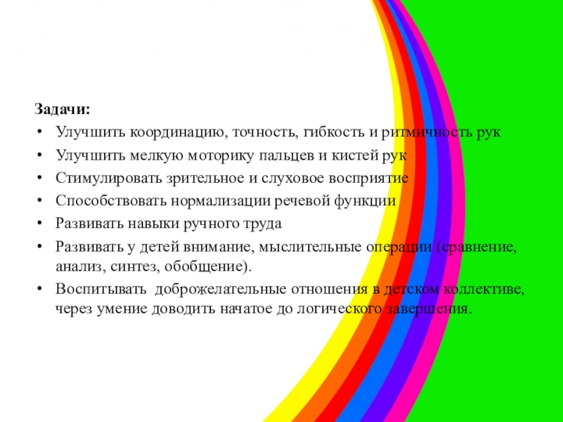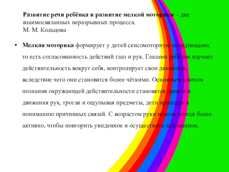 Мелкая моторика формирует у детей сенсомоторную координацию, то есть согласованность действий глаз и рук. Глазами ребёнок изучает действительность вокруг себя, контролирует свои движения, вследствие чего они становятся более чёткими. Основным ключом познания окружающей действительности становятся зрение и движения рук, трогая и ощупывая предметы, дети приходят к пониманию причинных связей. С возрастом руки используются более активно, чтобы повторить увиденное и осуществить задуманное.