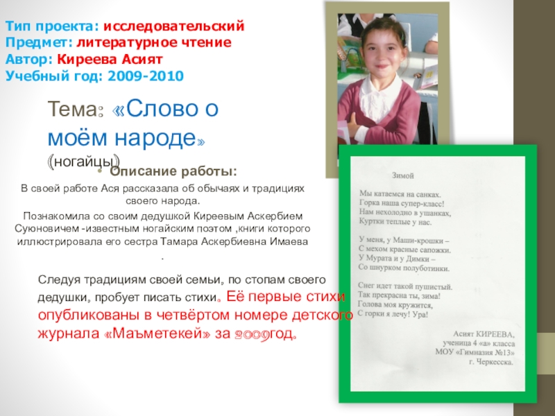 В своей работе Ася рассказала об обычаях и традициях своего народа.