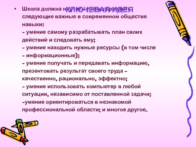 Слайд 8Школа должна научить ученика развить следующие важные в современном обществе навыки: