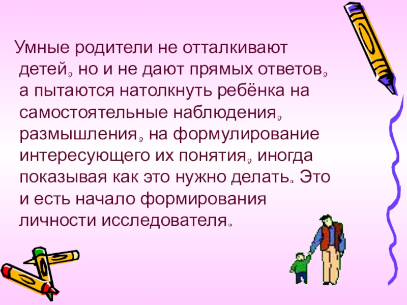 ответов, а пытаются натолкнуть ребёнка на самостоятельные наблюдения, размышления, на формулирование интересующего их понятия, иногда показывая как это нужно делать. Это и есть начало формирования личности исследователя.