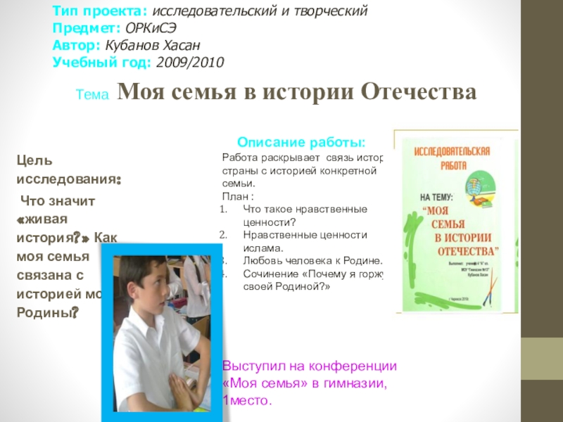 Выступил на конференции «Моя семья» в гимназии, 1место.