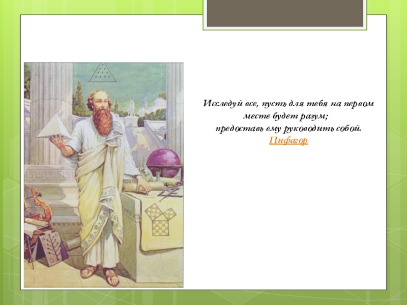 Слайд 7Исследуй все, пусть для тебя на первом месте будет разум;