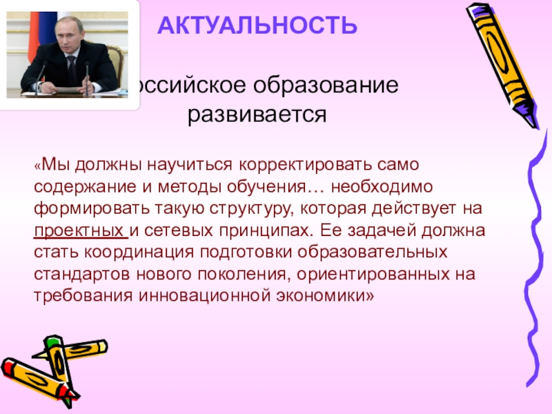необходимо формировать такую структуру, которая действует на проектных и сетевых принципах. Ее задачей должна стать координация подготовки образовательных стандартов нового поколения, ориентированных на требования инновационной экономики»