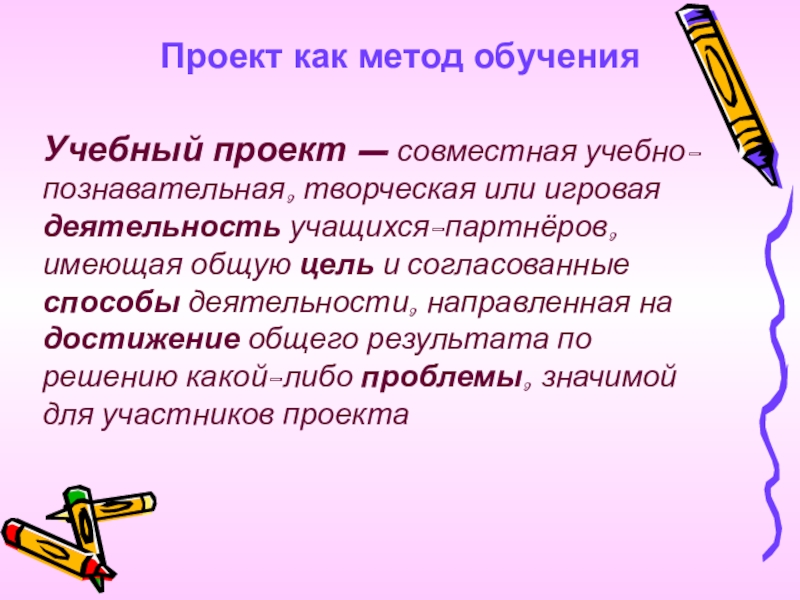 деятельность учащихся-партнёров, имеющая общую цель и согласованные способы деятельности, направленная на достижение общего результата по решению какой-либо проблемы, значимой для участников проекта