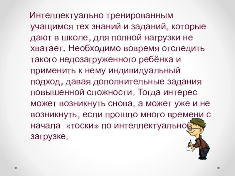 в школе, для полной нагрузки не хватает. Необходимо вовремя отследить такого недозагруженного ребёнка и применить к нему индивидуальный подход, давая дополнительные задания повышенной сложности. Тогда интерес может возникнуть снова, а может уже и не возникнуть, если прошло много времени с начала «тоски» по интеллектуальной загрузке.