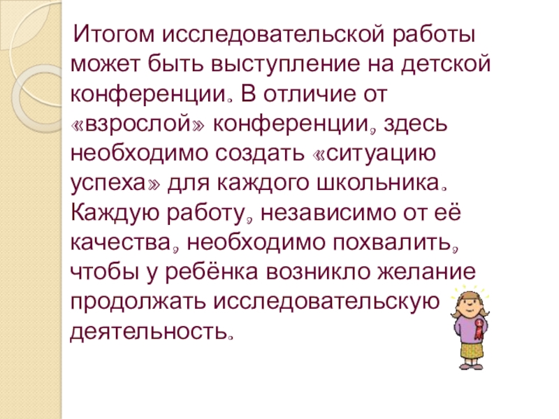 Слайд 24 Итогом исследовательской работы может быть выступление на детской конференции.
