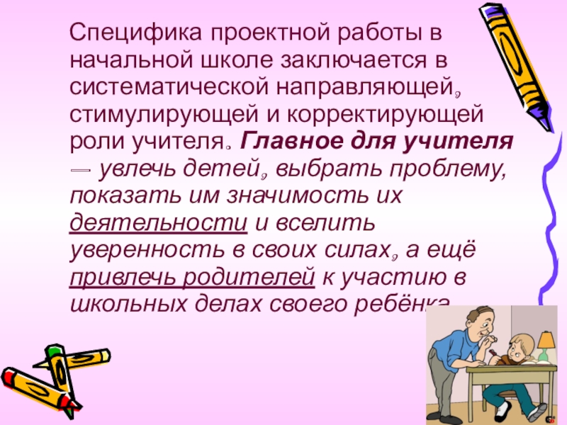 направляющей, стимулирующей и корректирующей роли учителя. Главное для учителя – увлечь детей, выбрать проблему, показать им значимость их деятельности и вселить уверенность в своих силах, а ещё привлечь родителей к участию в школьных делах своего ребёнка.
