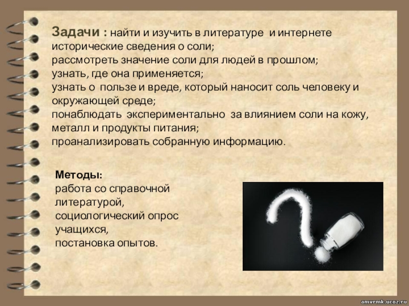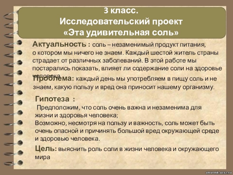 Проблема: каждый день мы употребляем в пищу соль и не знаем, какую пользу и вред она приносит нашему организму.