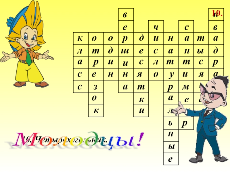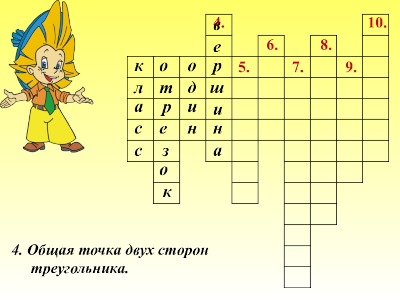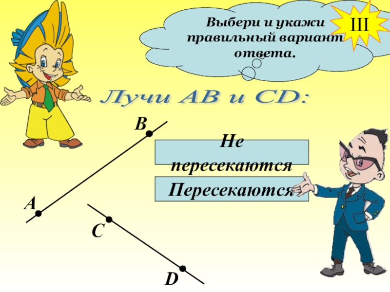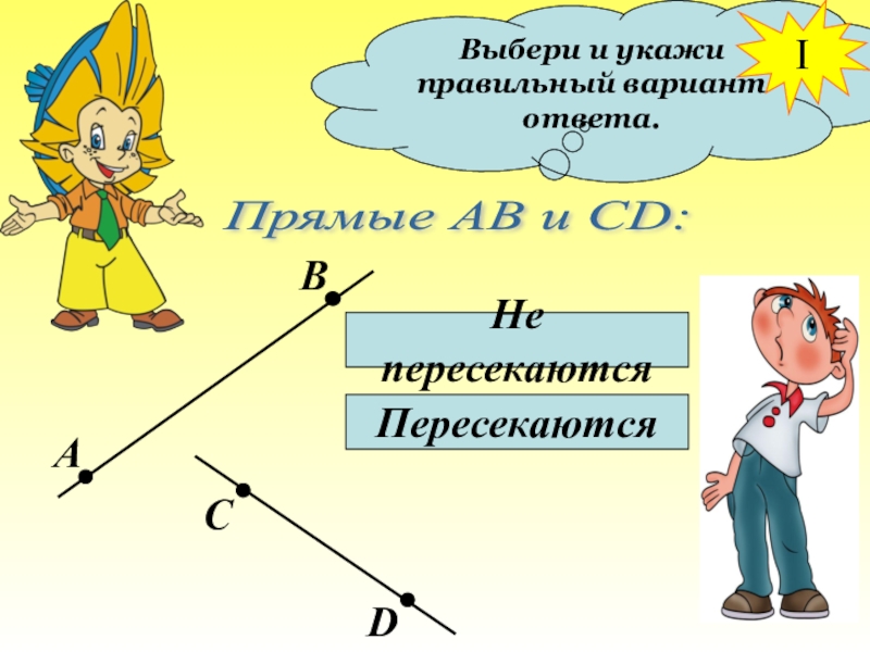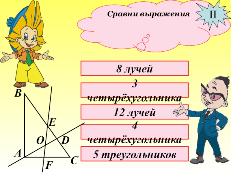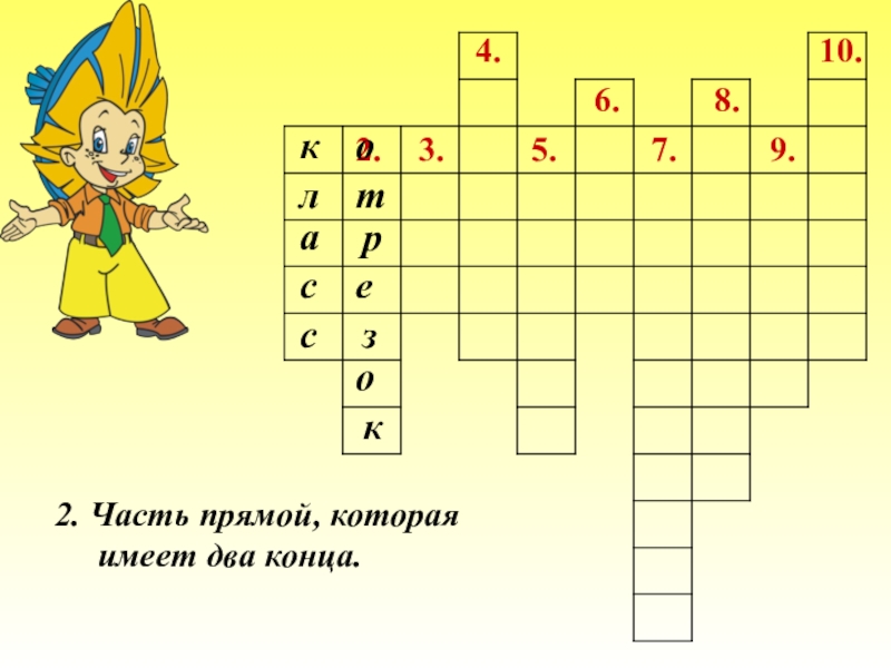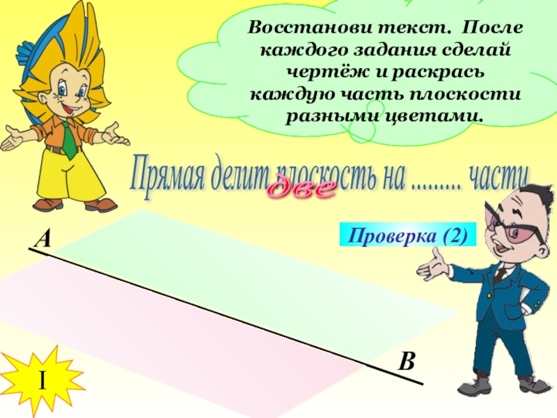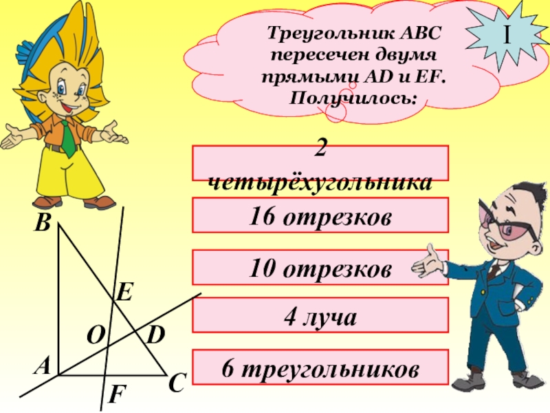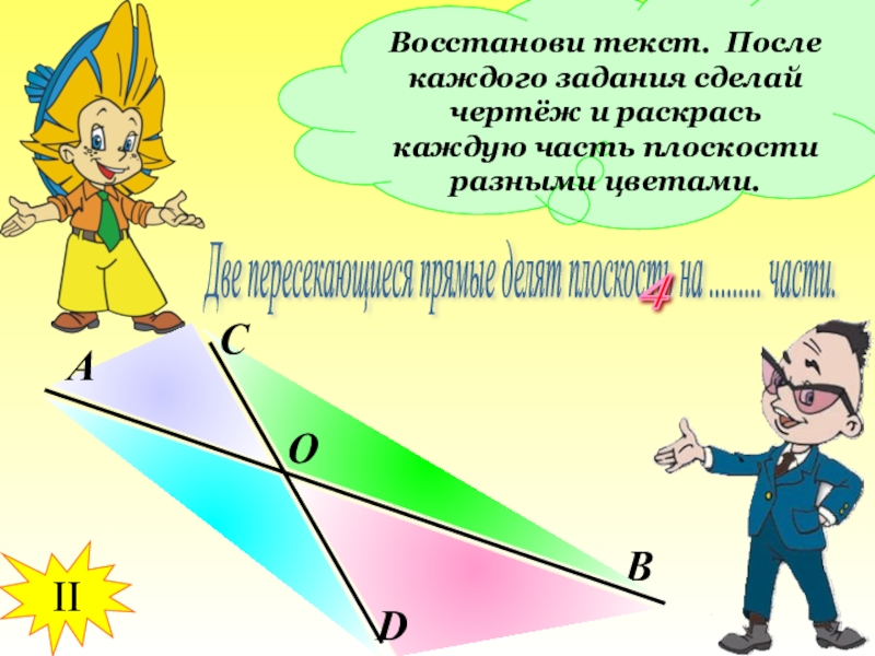 Две пересекающиеся прямые делят плоскость на ......... части.