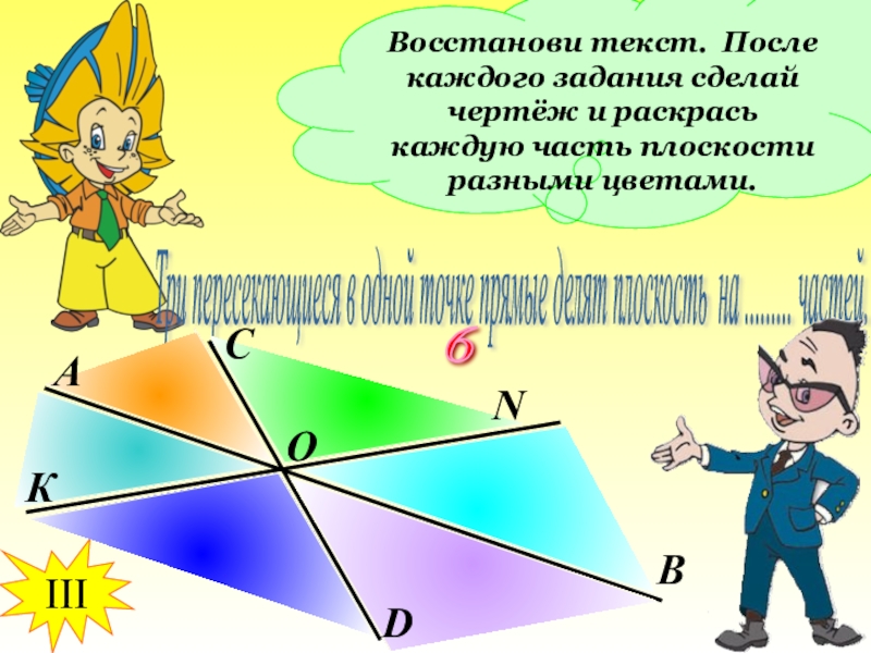 Три пересекающиеся в одной точке прямые делят плоскость на ......... частей.