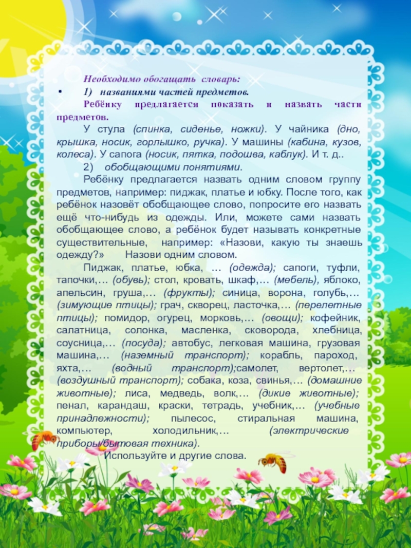 Пиджак, платье, юбка, … (одежда); сапоги, туфли, тапочки,… (обувь); стол, кровать, шкаф,… (мебель), яблоко, апельсин, груша,… (фрукты); синица, ворона, голубь,… (зимующие птицы); грач, скворец, ласточка,… (перелетные птицы); помидор, огурец, морковь,… (овощи); кофейник, салатница, солонка, масленка, сковорода, хлебница, соусница,… (посуда); автобус, легковая машина, грузовая машина,… (наземный транспорт); корабль, пароход, яхта,… (водный транспорт);самолет, вертолет,… (воздушный транспорт); собака, коза, свинья,… (домашние животные); лиса, медведь, волк,… (дикие животные); пенал, карандаш, краски, тетрадь, учебник,… (учебные принадлежности); пылесос, стиральная машина, компьютер, холодильник,… (электрические приборы/бытовая техника).