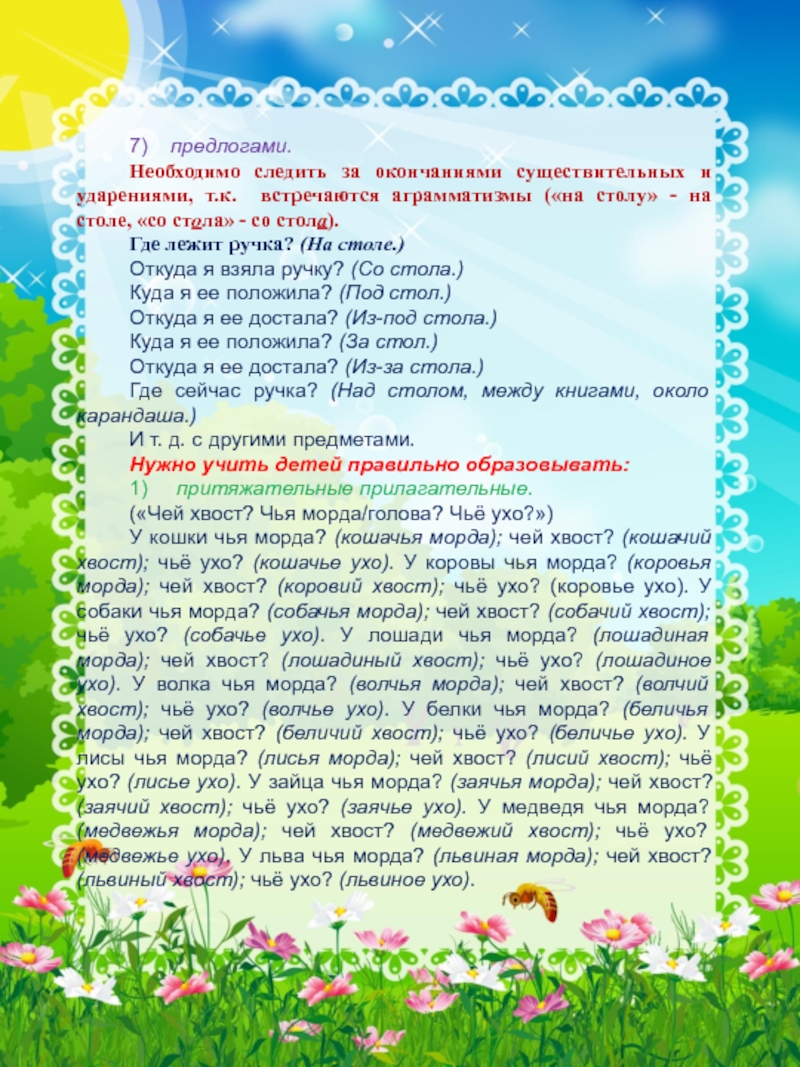 У кошки чья морда? (кошачья морда); чей хвост? (кошачий хвост); чьё ухо? (кошачье ухо). У коровы чья морда? (коровья морда); чей хвост? (коровий хвост); чьё ухо? (коровье ухо). У собаки чья морда? (собачья морда); чей хвост? (собачий хвост); чьё ухо? (собачье ухо). У лошади чья морда? (лошадиная морда); чей хвост? (лошадиный хвост); чьё ухо? (лошадиное ухо). У волка чья морда? (волчья морда); чей хвост? (волчий хвост); чьё ухо? (волчье ухо). У белки чья морда? (беличья морда); чей хвост? (беличий хвост); чьё ухо? (беличье ухо). У лисы чья морда? (лисья морда); чей хвост? (лисий хвост); чьё ухо? (лисье ухо). У зайца чья морда? (заячья морда); чей хвост? (заячий хвост); чьё ухо? (заячье ухо). У медведя чья морда? (медвежья морда); чей хвост? (медвежий хвост); чьё ухо? (медвежье ухо). У льва чья морда? (львиная морда); чей хвост? (львиный хвост); чьё ухо? (львиное ухо).