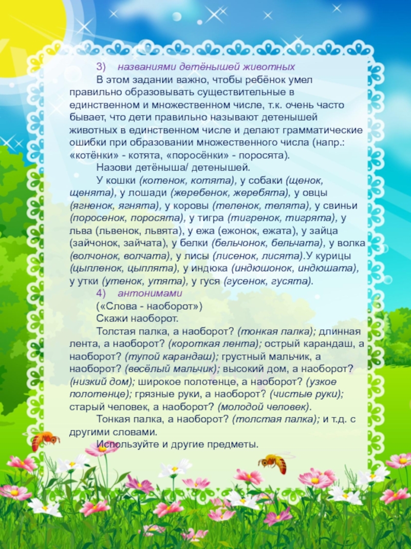 правильно образовывать существительные в единственном и множественном числе, т.к. очень часто бывает, что дети правильно называют детенышей животных в единственном числе и делают грамматические ошибки при образовании множественного числа (напр.: «котёнки» - котята, «поросёнки» - поросята).