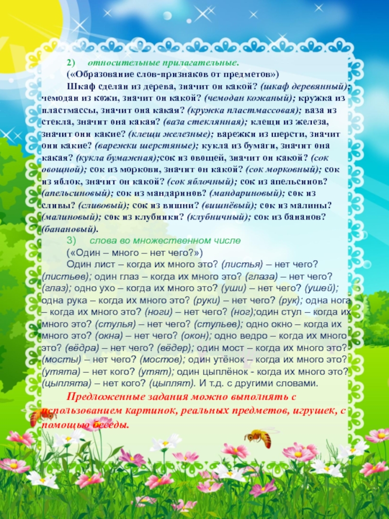 значит он какой? (шкаф деревянный); чемодан из кожи, значит он какой? (чемодан кожаный); кружка из пластмассы, значит она какая? (кружка пластмассовая); ваза из стекла, значит она какая? (ваза стеклянная); клещи из железа, значит они какие? (клещи железные); варежки из шерсти, значит они какие? (варежки шерстяные); кукла из бумаги, значит она какая? (кукла бумажная);сок из овощей, значит он какой? (сок овощной); сок из моркови, значит он какой? (сок морковный); сок из яблок, значит он какой? (сок яблочный); сок из апельсинов? (апельсиновый); сок из мандаринов? (мандариновый); сок из сливы? (сливовый); сок из вишни? (вишнёвый); сок из малины? (малиновый); сок из клубники? (клубничный); сок из бананов? (банановый).