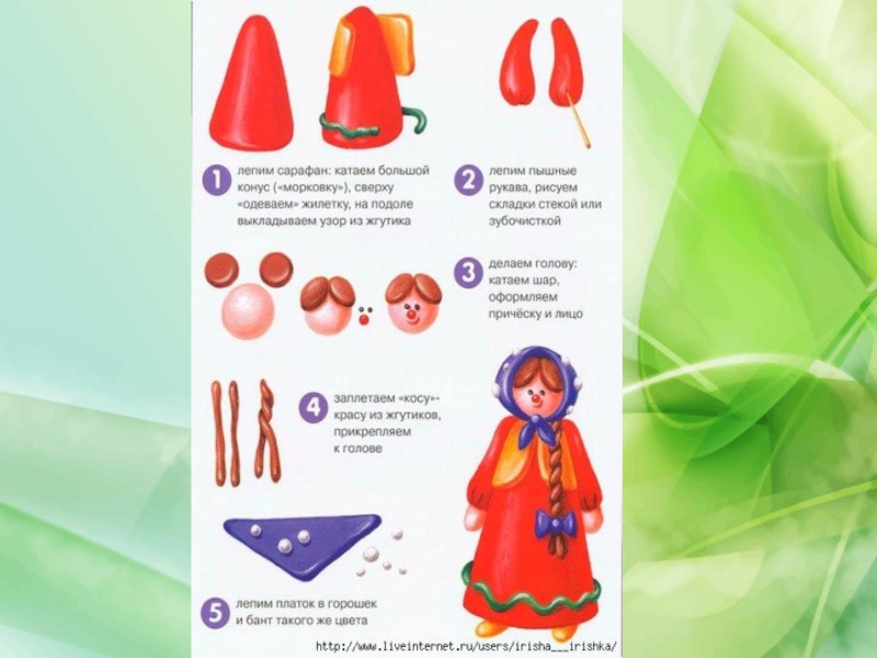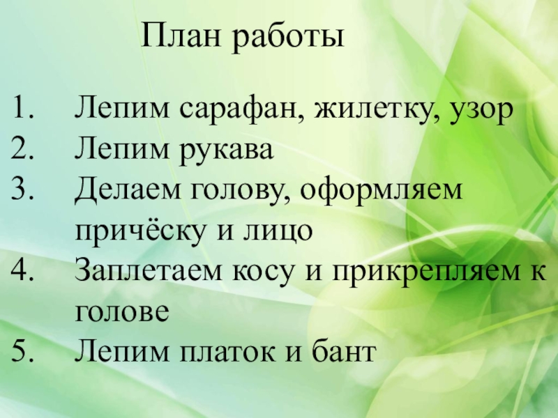 План работыЛепим сарафан, жилетку, узорЛепим рукаваДелаем голову, оформляем причёску и лицоЗаплетаем косу и прикрепляем к головеЛепим платок