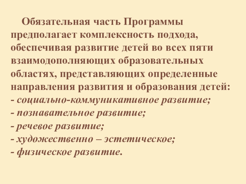 Слайд 9 Обязательная часть Программы предполагает комплексность подхода, обеспечивая развитие детей