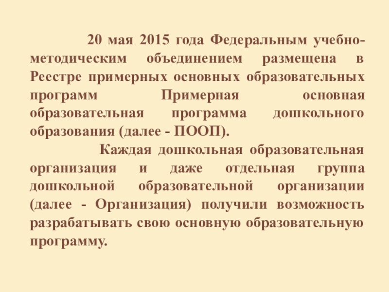 объединением размещена в Реестре примерных основных образовательных программ Примерная основная образовательная программа дошкольного образования (далее - ПООП).