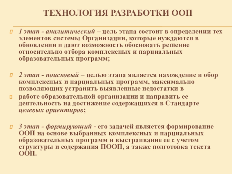 3 этап - формирующий - его задачей является формирование ООП на основе выбранных комплексных и парциальных образовательных программ и выстраивание ее с учетом структуры и содержания ПООП, а также подготовка текста ООП.