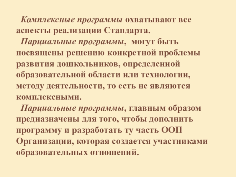 Парциальные программы, главным образом предназначены для того, чтобы дополнить программу и разработать ту часть ООП Организации, которая создается участниками образовательных отношений.
