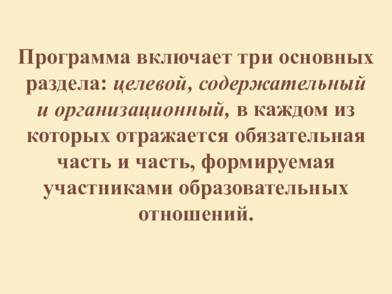 Слайд 8Программа включает три основных раздела: целевой, содержательный и организационный, в каждом