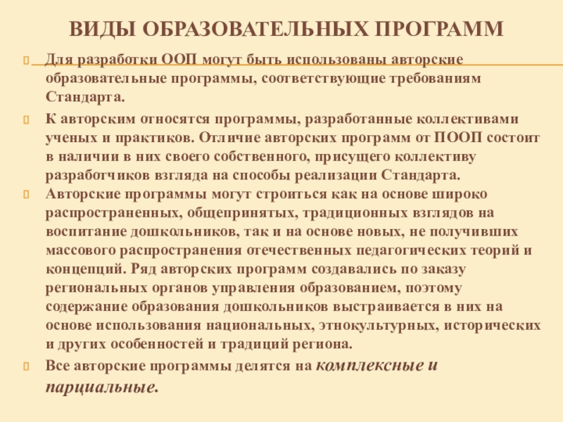 Авторские программы могут строиться как на основе широко распространенных, общепринятых, традиционных взглядов на воспитание дошкольников, так и на основе новых, не получивших массового распространения отечественных педагогических теорий и концепций. Ряд авторских программ создавались по заказу региональных органов управления образованием, поэтому содержание образования дошкольников выстраивается в них на основе использования национальных, этнокультурных, исторических и других особенностей и традиций региона.