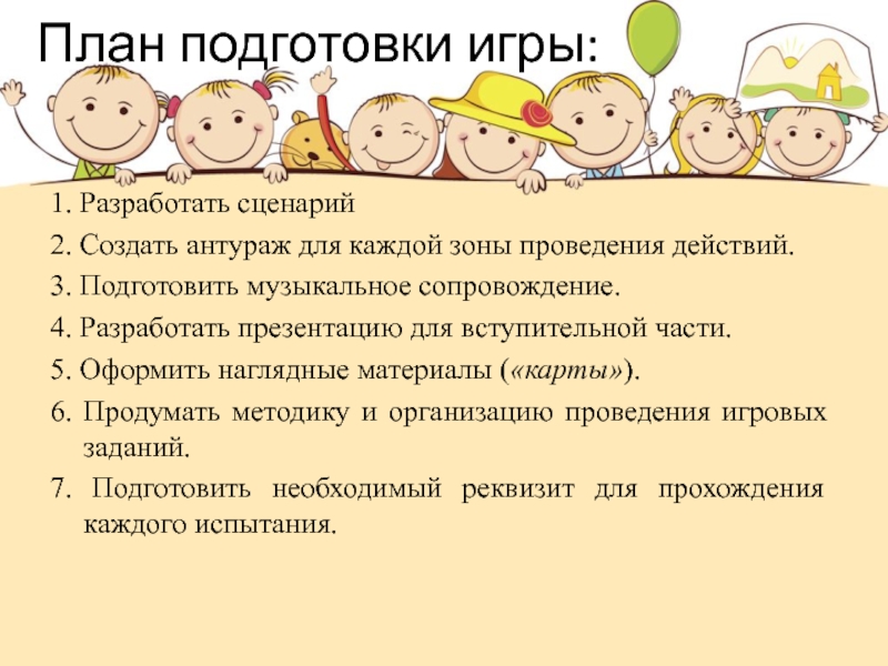 План подготовки игры:1. Разработать сценарий2. Создать антураж для каждой зоны проведения действий.3. Подготовить музыкальное сопровождение.4. Разработать презентацию