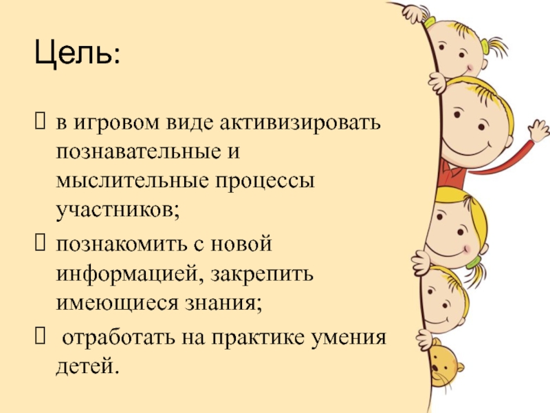 Цель:в игровом виде активизировать познавательные и мыслительные процессы участников; познакомить с новой информацией, закрепить имеющиеся знания; отработать