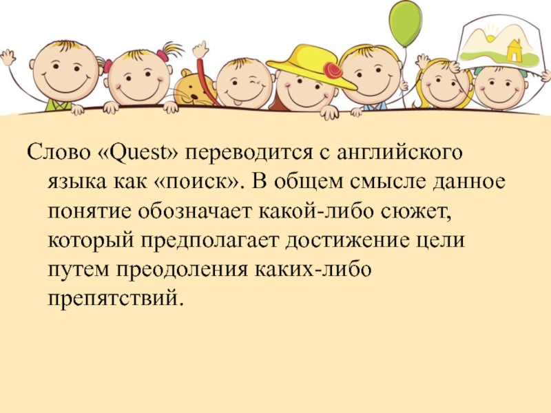 Слайд 2Слово «Quest» переводится с английского языка как «поиск». В общем смысле