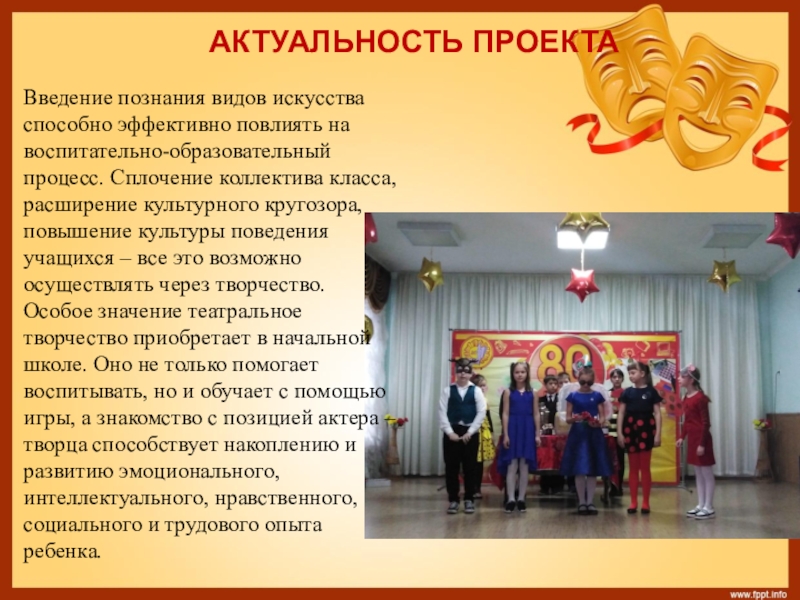 творчество приобретает в начальной школе. Оно не только помогает воспитывать, но и обучает с помощью игры, а знакомство с позицией актера – творца способствует накоплению и развитию эмоционального, интеллектуального, нравственного, социального и трудового опыта