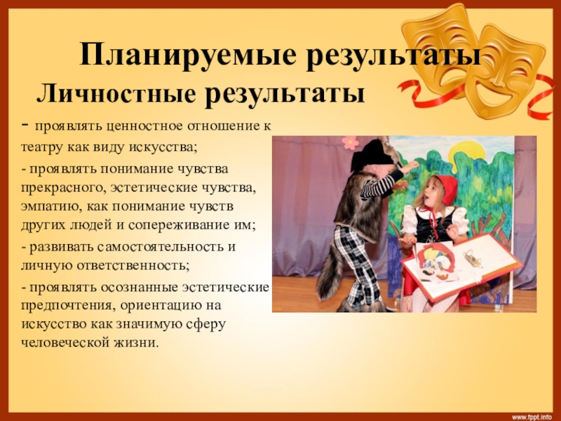 - проявлять ценностное отношение к театру как виду искусства;