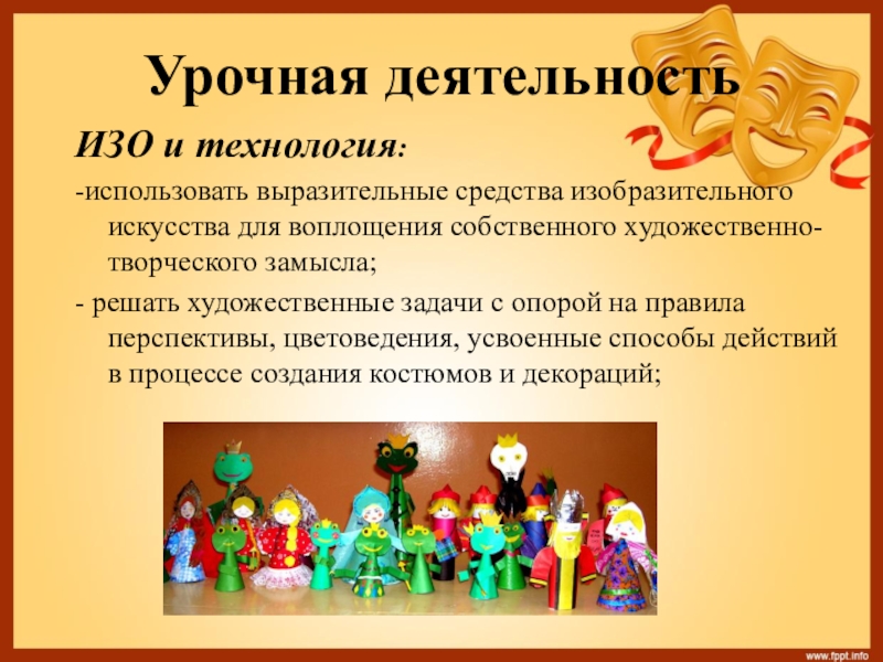 Слайд 17На уроках “Технология” и “ИЗО” идет подготовка театральных декораций, костюмов, афиш.